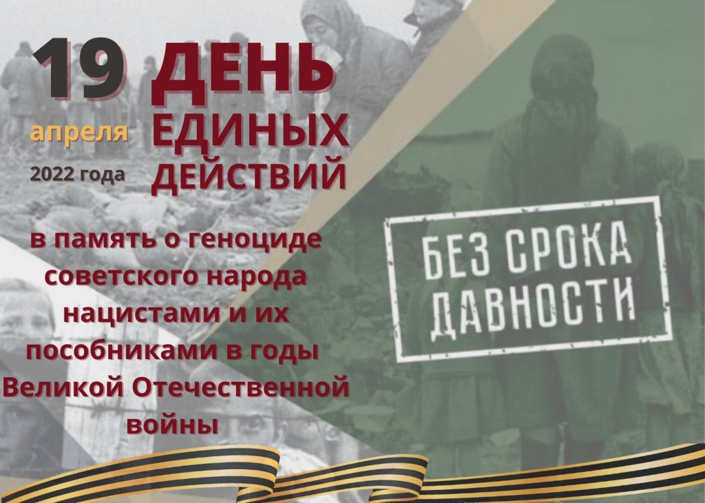19 апреля 2022 года во всех образовательных организациях России проводится День единых действий в память о геноциде советского народа нацистами и их пособниками в годы Великой Отечественной войны 1941 – 1945 гг. Цель проведения Дня единых действий – сохранение исторической правды о преступлениях нацистов и их пособников в отношении мирных советских граждан в годы Великой Отечественной войны на оккупированной территории.