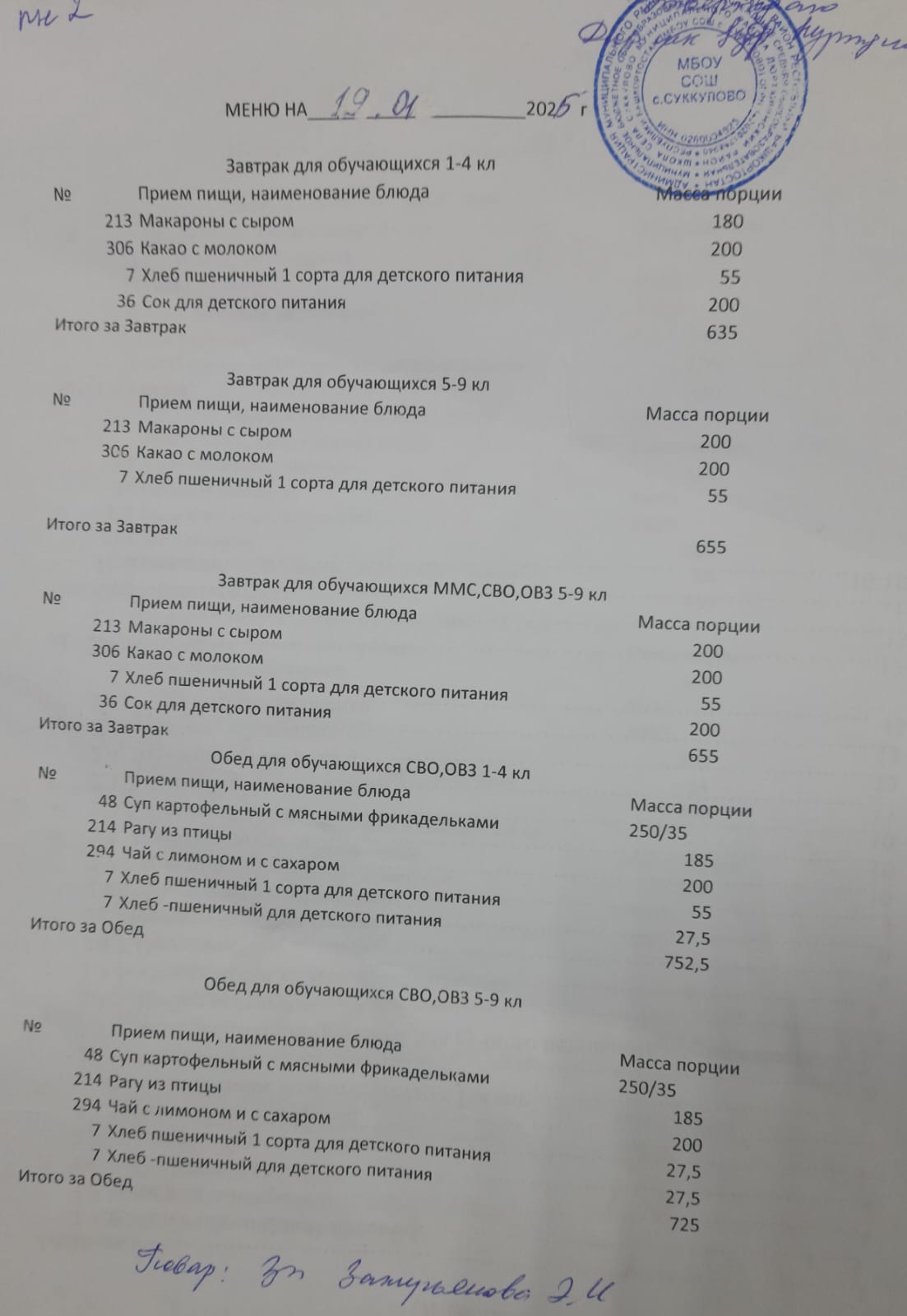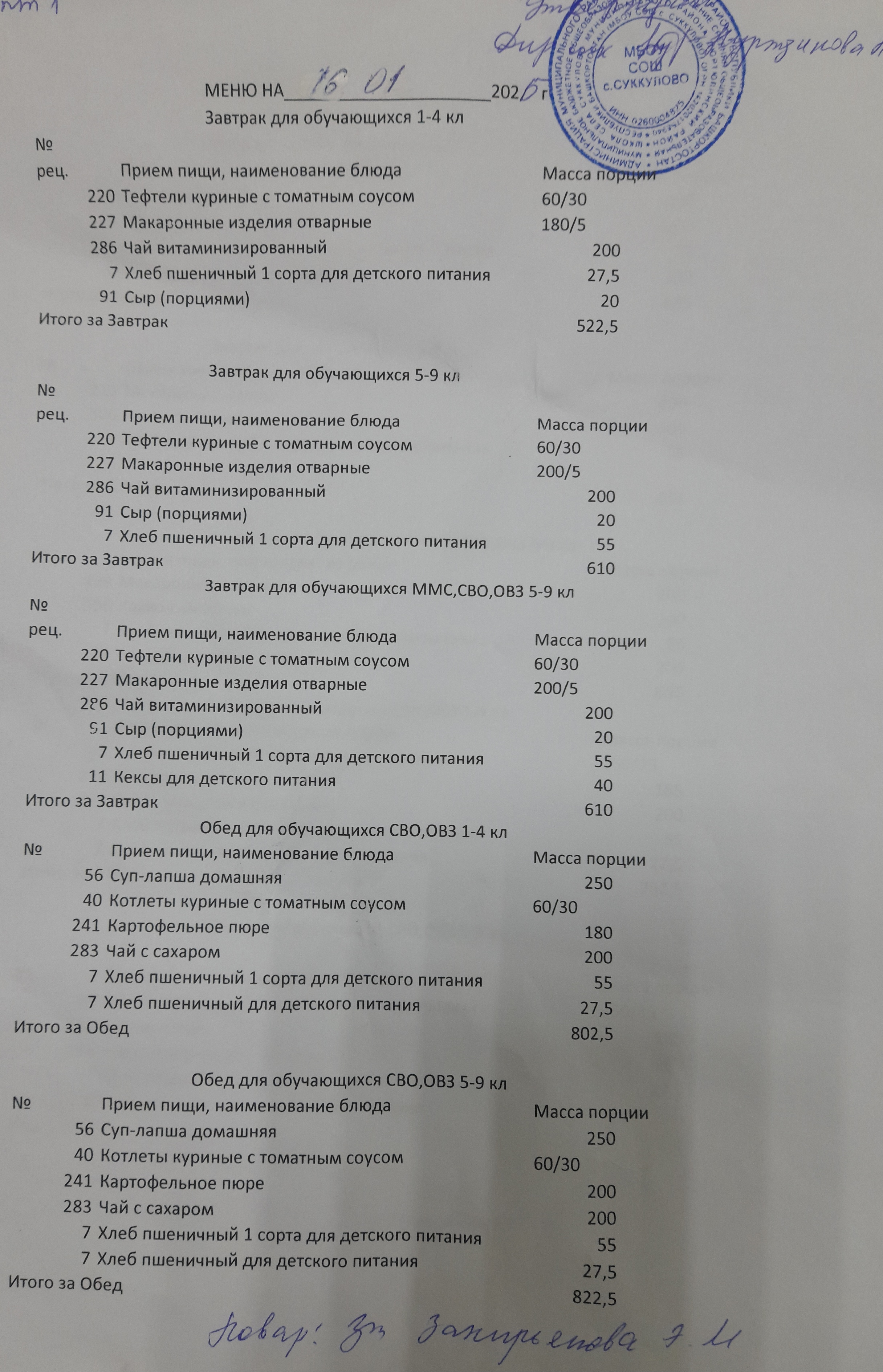 (Меню школьный столовый)