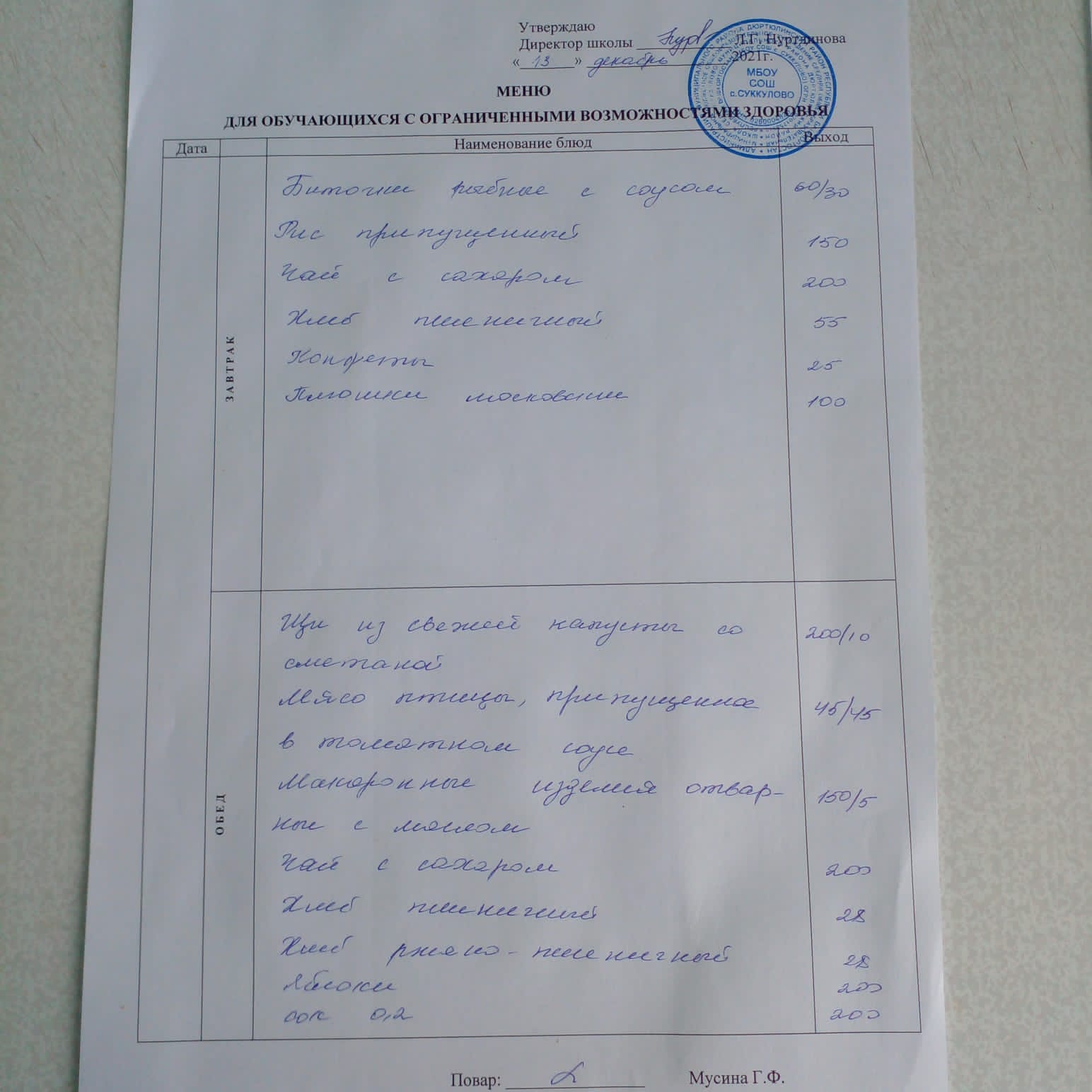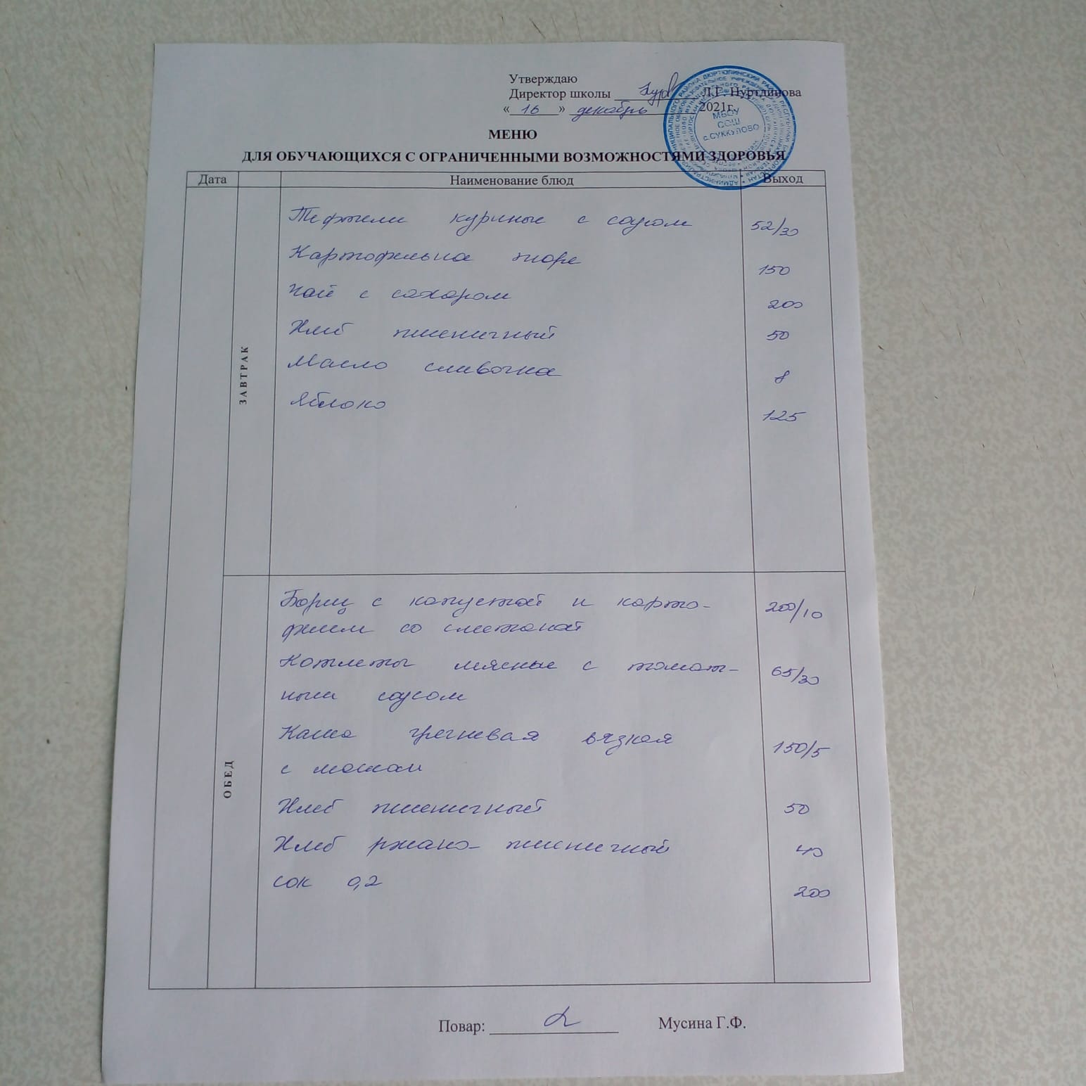 (Меню для обучающихся с ОВЗ.)