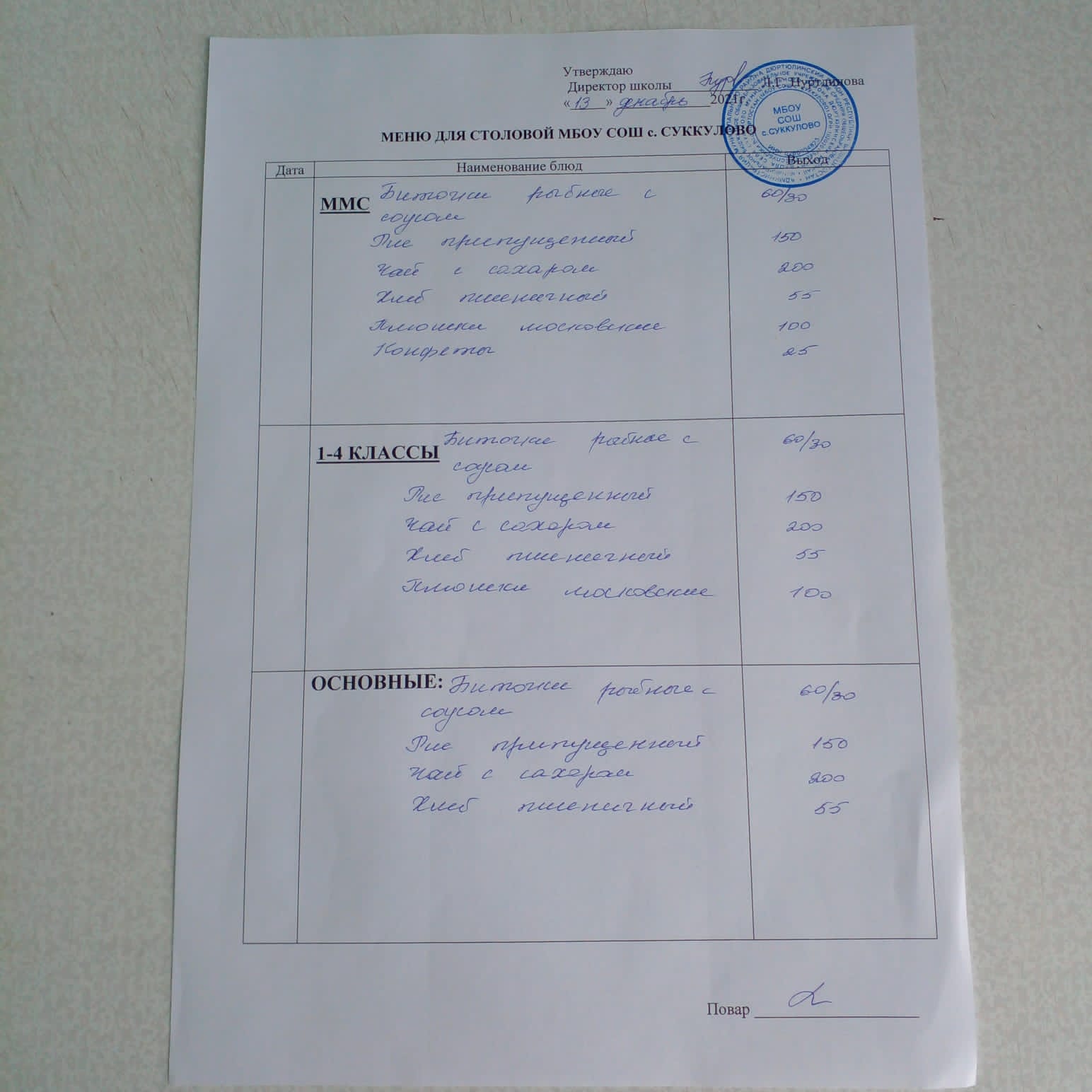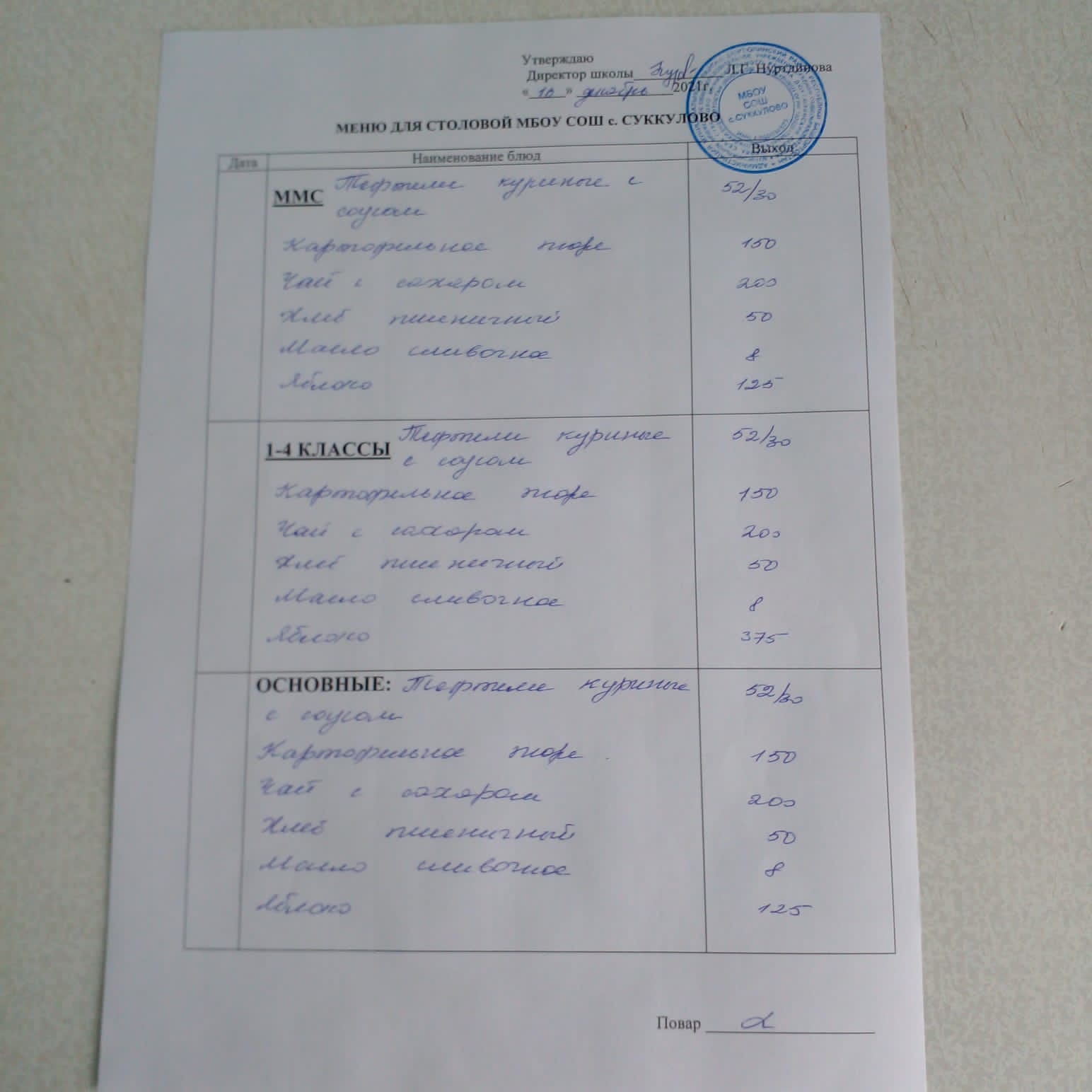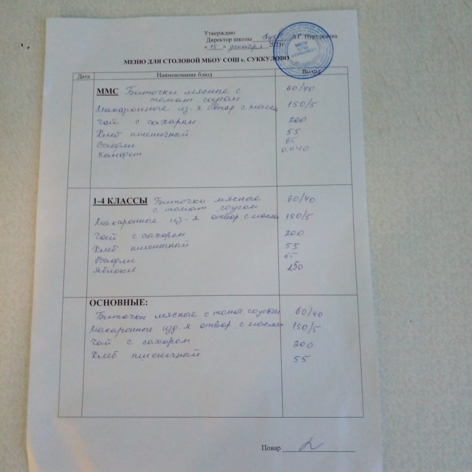 ((Меню для обучающихся из ММС, 1-4 классов, основные))