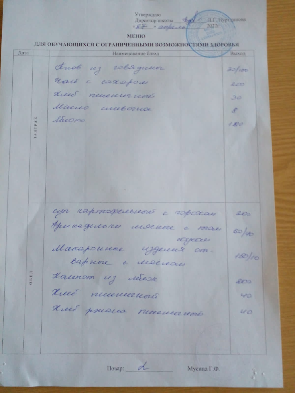 (Меню для обучающихся с ОВЗ)