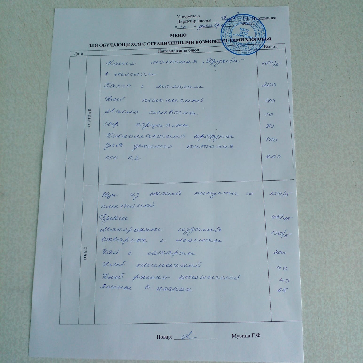 (Меню для обучающихся с ОВЗ)
