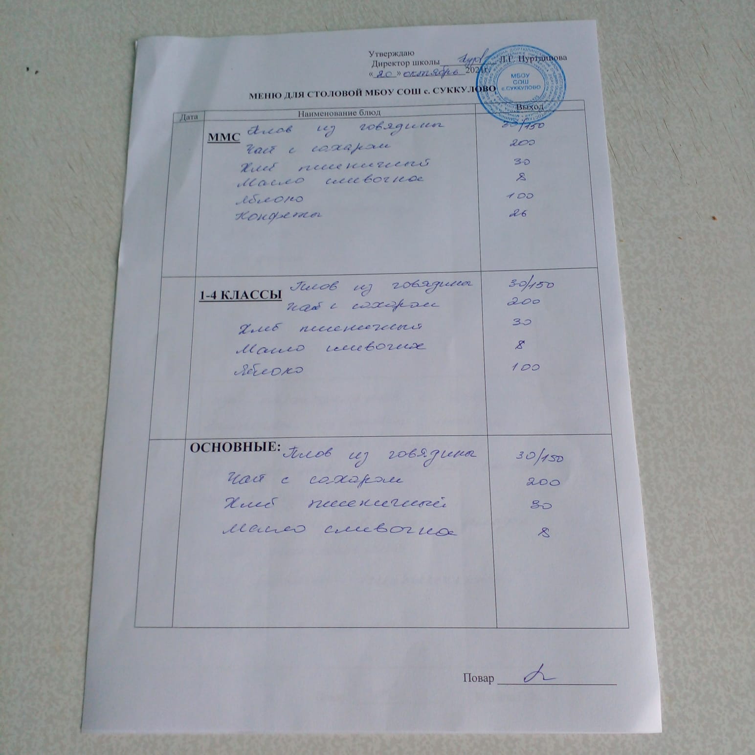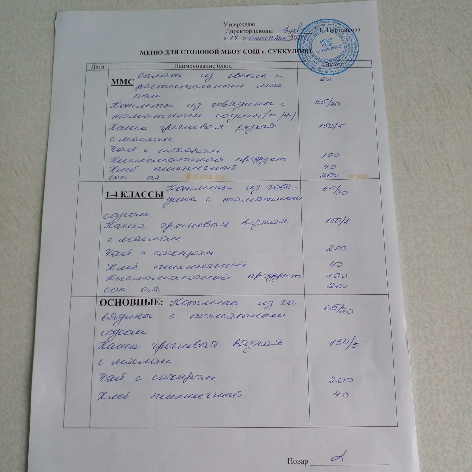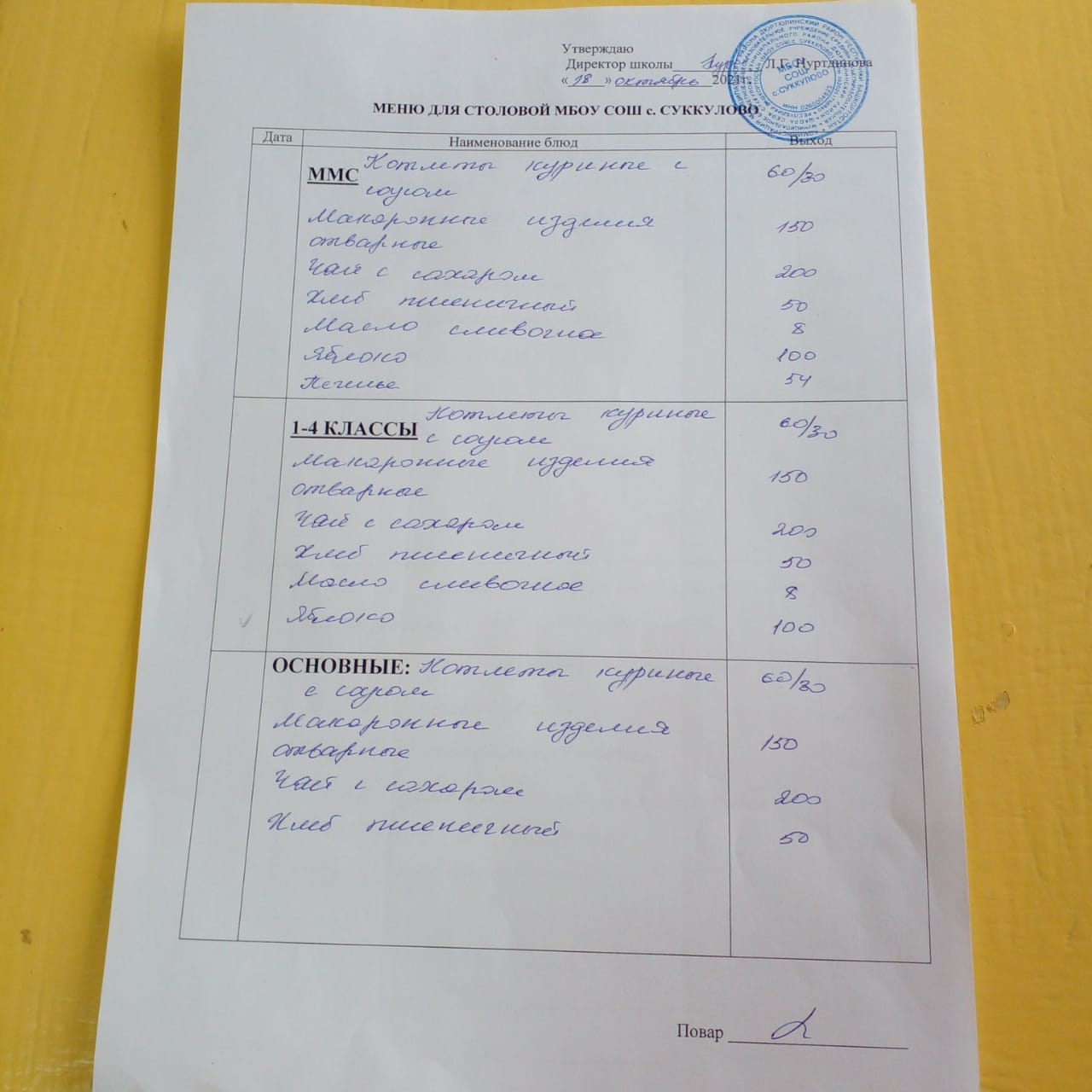(Меню на 21.10.2021г. для обучающихся из ММС, 1-4 классы, основные)