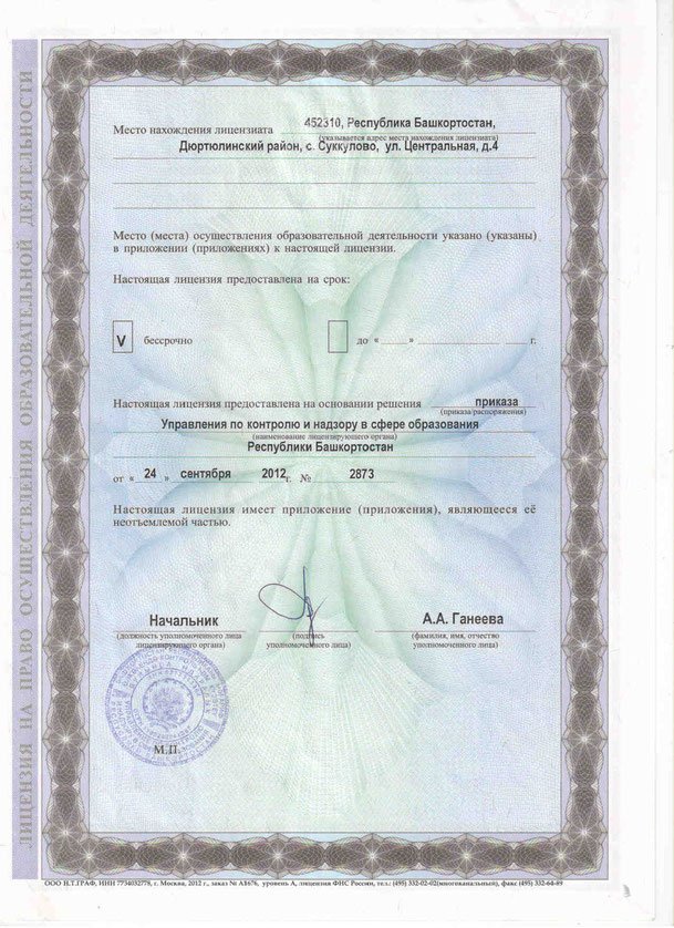 | Адрес места нахождения образовательной организации | 452310, РБ, Дюртюлинский район, с. Суккулово, улица Центральная 4. |