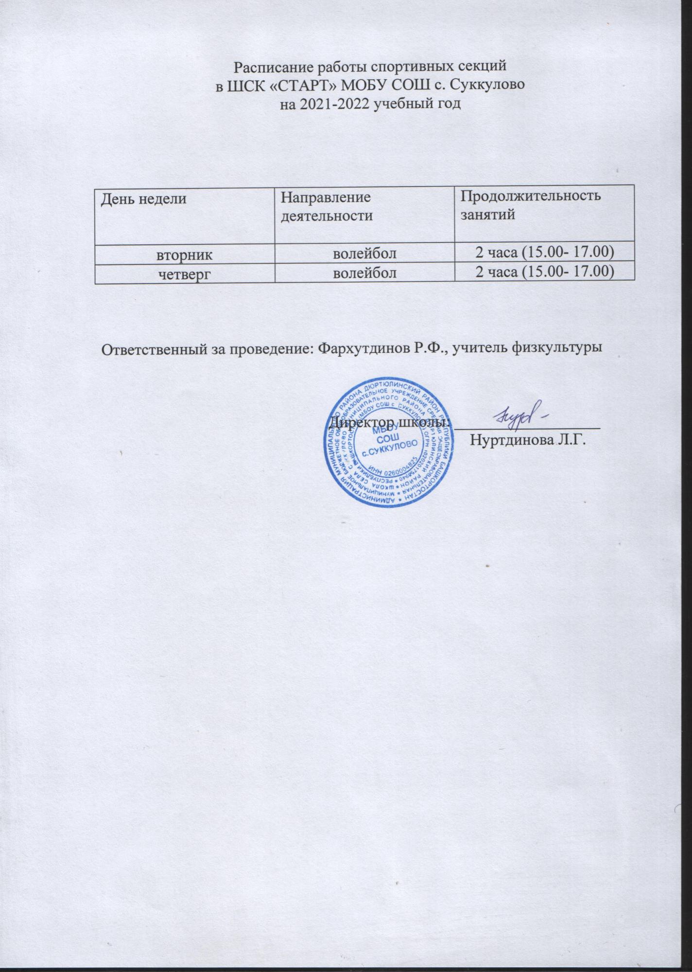 Расписание работы спортивных секций в ШСК "Старт" МОБУ СОШ с.Суккулово на 2021-2022 учебный год
