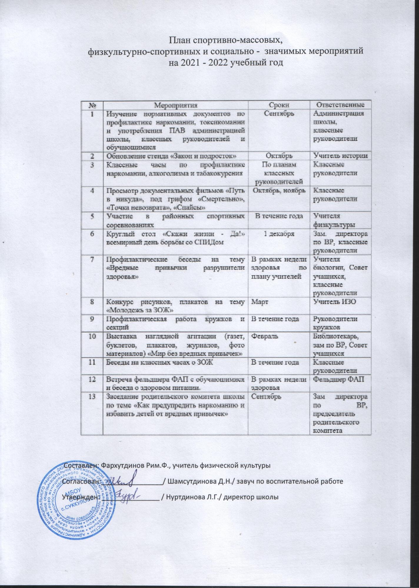 План спортивно - массовых, физкультурно - спортивных и социально-значимых мероприятий на 2021-2022 учебный год